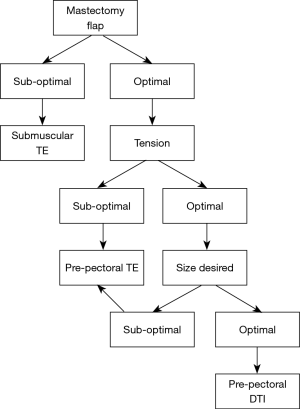 Intra-operatively, the decision on which type of reconstruction to pursue should be made based on the viability of the mastectomy flaps, the tension on closure and the ultimate desired size, in a step-wise fashion.