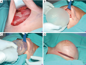 The second stage with the pre-pectoral tissue expander to implant exchange is demonstrated in Figure 2.