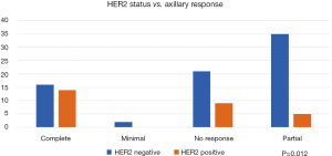 Another tumour biomarker is HER2 over-expression that can be found in 18–20% of breast cancers, and/or HER2 amplification which is found in 5–30% (20). Those patients who achieve a pCR after NACT with anti HER2 drugs also showed a better disease free and overall survival compared to those without anti HER2 treatment. Better responses and pCR are to be expected in HER2 positive with HR negative tumours (21). As expected, our study has shown statistically significant correlation between the HER2 status and the response in the axilla (P=0.012), Figure 3 shows that 50% of HER2 positive patient achieved a PCR in the axilla versus 21% of HER2 negative patients.