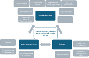 Earlier work by Hamnett & Subramanian [2016] highlighted psychosocial and practical influences including body-image, cancer-related concerns, employment, and caregiving responsibilities as important determinants of reconstruction decisions in older women (20). Our review advances this literature by integrating these insights with more recent evidence and systematically organizing factors using the framework proposed in our previous systematic literature reviews (17,18) into patient-associated factors, physician-associated factors, and systemic factors (Figure 1). We present this article in accordance with the Narrative Review reporting checklist (available at https://abs.amegroups.com/article/view/10.21037/abs-25-48/rc).