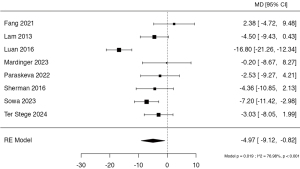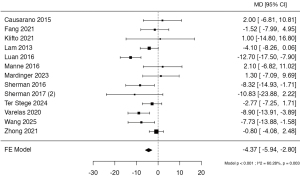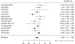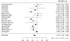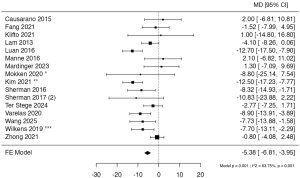 Due to the predominance of breast reconstruction PDAs, we conducted sub-analysis of these studies and re-assessed decisional conflict and decisional regret. We did not repeat the models for anxiety nor knowledge satisfaction as the studies included for previous inclusion and analysis already exclusively featured breast reconstruction PDAs. Breast reconstruction PDAs analysis was primarily analyzed via random effects approach: decisional conflict [MD, −4.39 (of 100 points); 95% CI: –7.11 to –1.66; 13 studies; P=0.002] and decisional regret [MD, −4.97 (of 100 points); 95% CI: −9.12 to –0.82; 8 studies; P=0.02] (Figures 11,12). It was then re-analyzed through a fixed effects approach: decisional conflict [MD, −4.37 (of 100 points); 95% CI: –5.94 to –2.80; 13 studies; P <0.001] and decisional regret [MD, –6.25 (of 100 points); 95% CI: −8.19 to –4.32; 8 studies; P <0.001] (Figures 13,14).