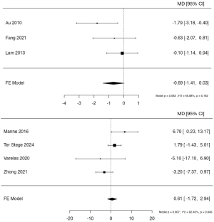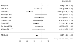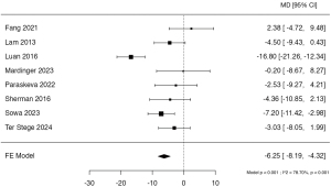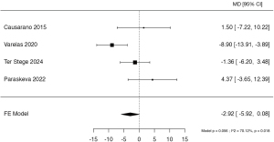 To confirm the consistency of our models, we re-evaluated these same studies through a fixed effects approach (Figures 7-10). The fixed effects model yielded the following: decisional conflict [MD, −5.38 (of 100 points); 95% CI: –6.81 to –3.95; 16 studies; P<0.001] and decisional regret [MD, –6.15 (of 100 points); 95% CI: −8.04 to –4.26; 9 studies; P<0.001] (Figures 7,8). Decisional anxiety via HADS or STAI outcome measures were analyzed separately through the fixed effects approach and yielded the following: [HADS, MD, −0.69 (of 21 points); 95% CI: −1.41 to 0.03; 3 studies, P=0.06] and [STAI, MD, 0.61 (of 80 points); 95% CI: −1.72 to 2.94; 4 studies, P=0.61] (Figure 9). Satisfaction of knowledge via BREAST-Q through fixed effects approach confirmed directionality, yielding the following: [MD, −2.92 (of 100 points); 95% CI: –5.92 to 0.08; 4 studies; P=0.056] (Figure 10).