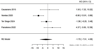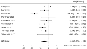 Anticipated heterogeneity was accounted for via random-effects approach, which assumes true effects vary across studies due to differences in patient populations, procedures, and PDA formats. To allow for the direct interpretation of pooled effects in the instruments’ units and calculation of mean differences (MD), studies were grouped to ensure uniform reporting using the same instrument and scale. Additionally, pooled estimates were recalculated using alternative statistical models, including both fixed-effects and random-effects approaches, to assess the robustness of findings to assumptions regarding between-study heterogeneity.