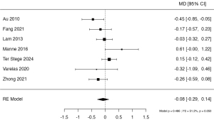 Across studies evaluating PDAs in PRS, aggregate analysis via random effects approach demonstrated a significant reduction in decisional conflict as well as decisional regret favoring intervention groups: decisional conflict [MD, –5.37 (of 100 points); 95% confidence interval (CI): –7.94 to –2.80; 16 studies; P<0.001] and decisional regret [MD, –4.93 (of 100 points); 95% CI: –8.73 to –1.12; 9 studies; P=0.01] (Figures 2,3). The negative MD indicated that participants who used PDAs reported lower decisional conflict and decisional regret scores (approximate decrease of 5 points on both instruments scales) compared with those receiving standard counseling or educational materials. Studies reported decisional anxiety via HADS or STAI outcome measures and were analyzed separately as [HADS, MD, −0.77 (of 21 points); 95% CI: –1.77 to 0.23; 3 studies, P=0.13)] and [STAI, MD =0.61 (of 80 points); 95% CI: –3.98 to 5.20; 4 studies, P=0.99] (Figure 4). When pooled together and remodeled to calculate a standardized mean difference (SMD), the model still did not reach significance (SMD =−0.08; 95% CI: –0.29 to 0.14; 7 studies, P=0.49) (Figure 5). Satisfaction of knowledge via BREAST-Q was also analyzed, showing directionality towards improved satisfaction in favor of PDA use, though it did not show significant differences [MD, −1.73 (of 100 points); 95% CI: –7.51 to 4.06; 4 studies; P=0.56] (Figure 6).